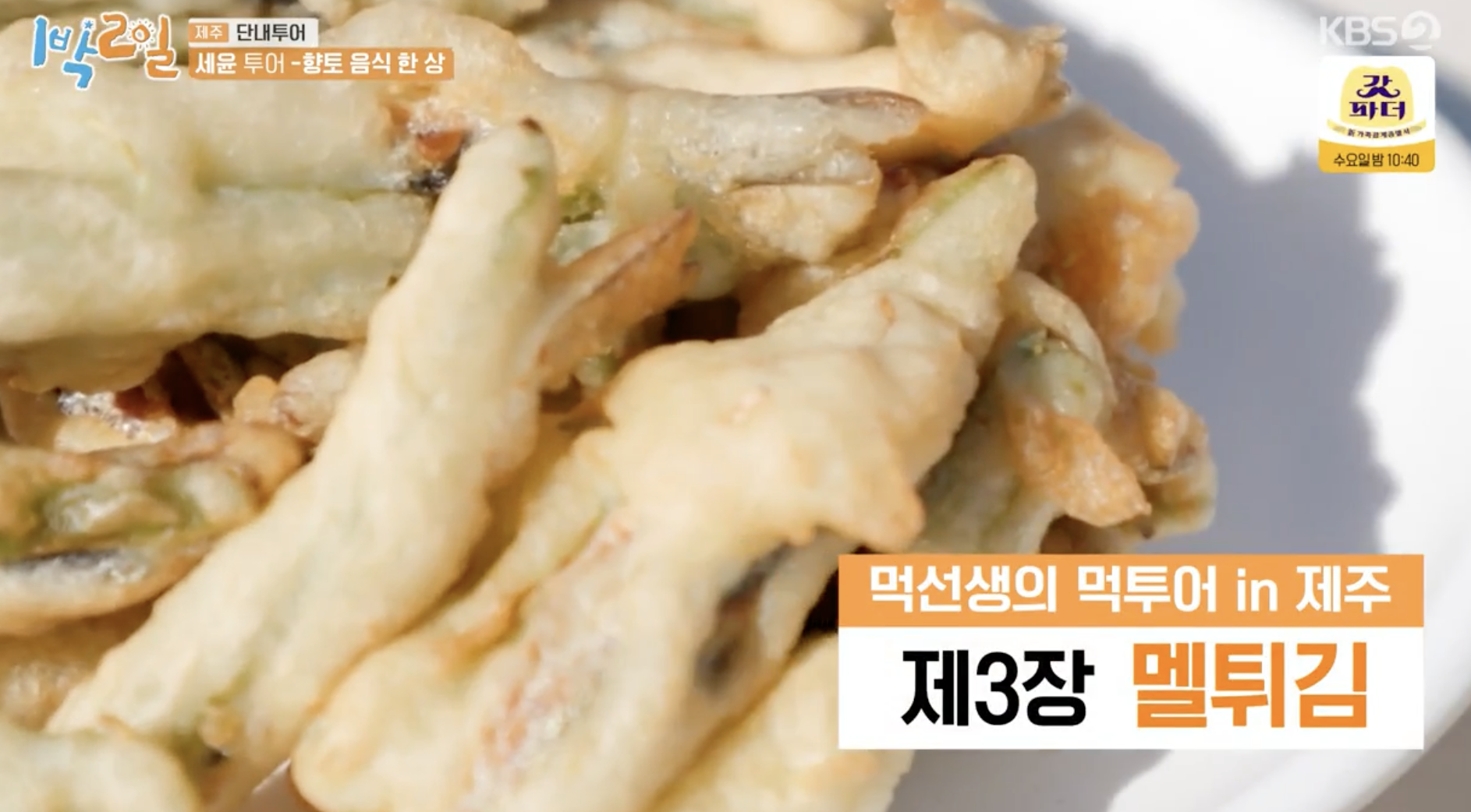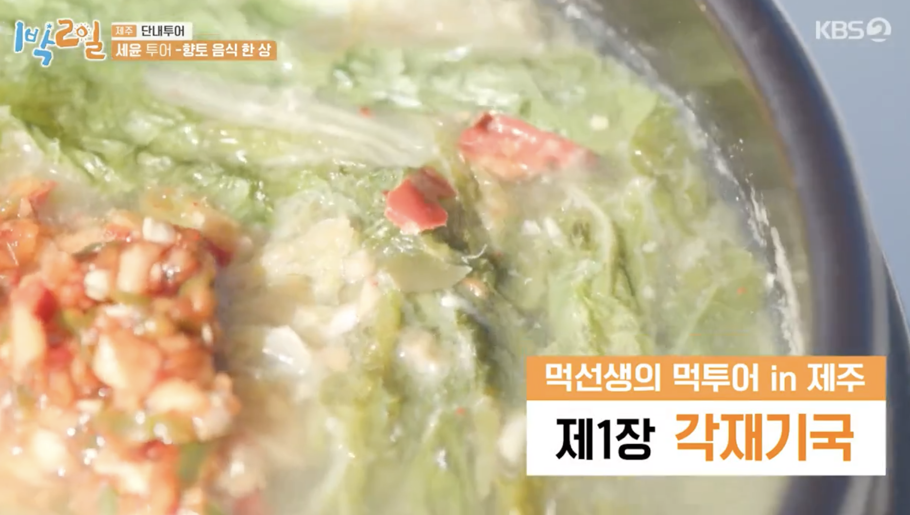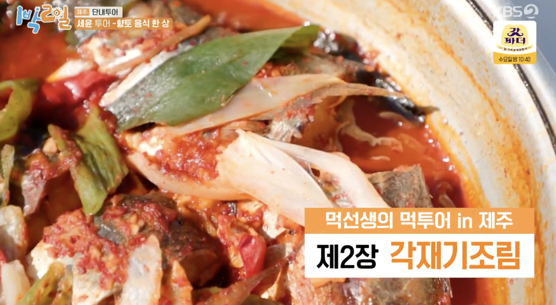 <1박2일> 출연진들이 점심을 먹으러 온 곳은 제주도 향토음식 한 상을 맛보는 것으로, 제주도에서 살고 있는 <맛있는 녀석들> 메인작가가 추천한 제주 맛집이라고 합니다. 추천 음식은 제주도 향토음식인 각재기(전갱이)로 만든 각재기국, 각재기 조림, 등입니다.